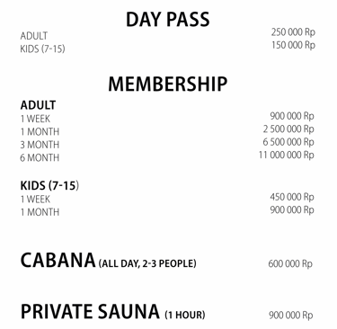 * Children aged 0-6 years are free (swimming diapers are required for young children). Children aged 16 and over are allowed into the gym with written permission from their parents or in their presence.