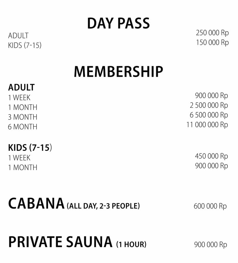 Day passes and memberships include access to the swimming pool, gym, cold plunge pool, sauna, and hammam. Changing rooms, lockers, and towels are also available